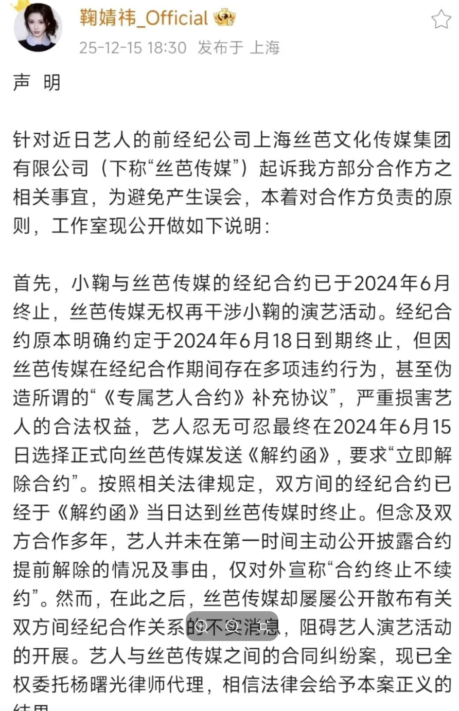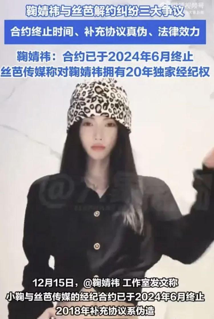 鞠婧祎方面则否定了补充协议的存在,认为双方的友好合作已于2024年6月就结束了,并且反手质疑公司伪造签名。
