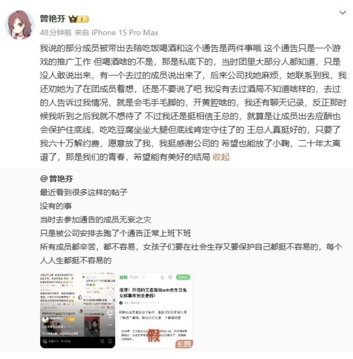 好不容易翻身拿到“最后告知书”,准备强行给鞠婧祎扣上个引导舆论的大帽子,没想到前成员曾艳芬又出来爆料了,称丝芭上市时曾安排艺人参与商务酒局。